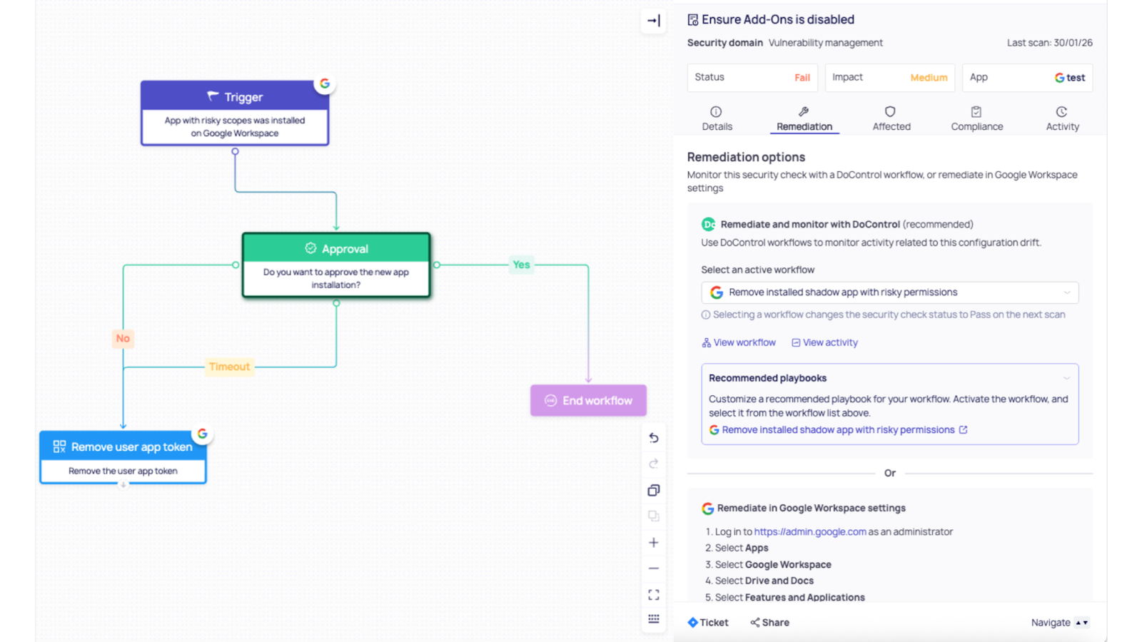 DoControl’s posture + workflow model is designed for this exact reality: SaaS environments change constantly, so security must operate continuously through real-time, policy-based workflows that detect, respond, and remediate with minimal manual effort.