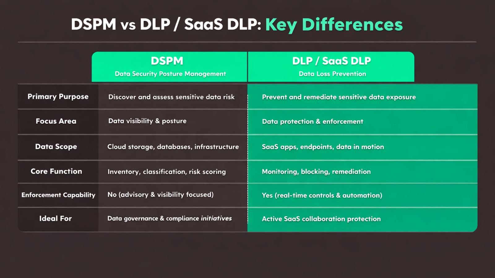 - DSPM focuses on data discovery and posture visibility.