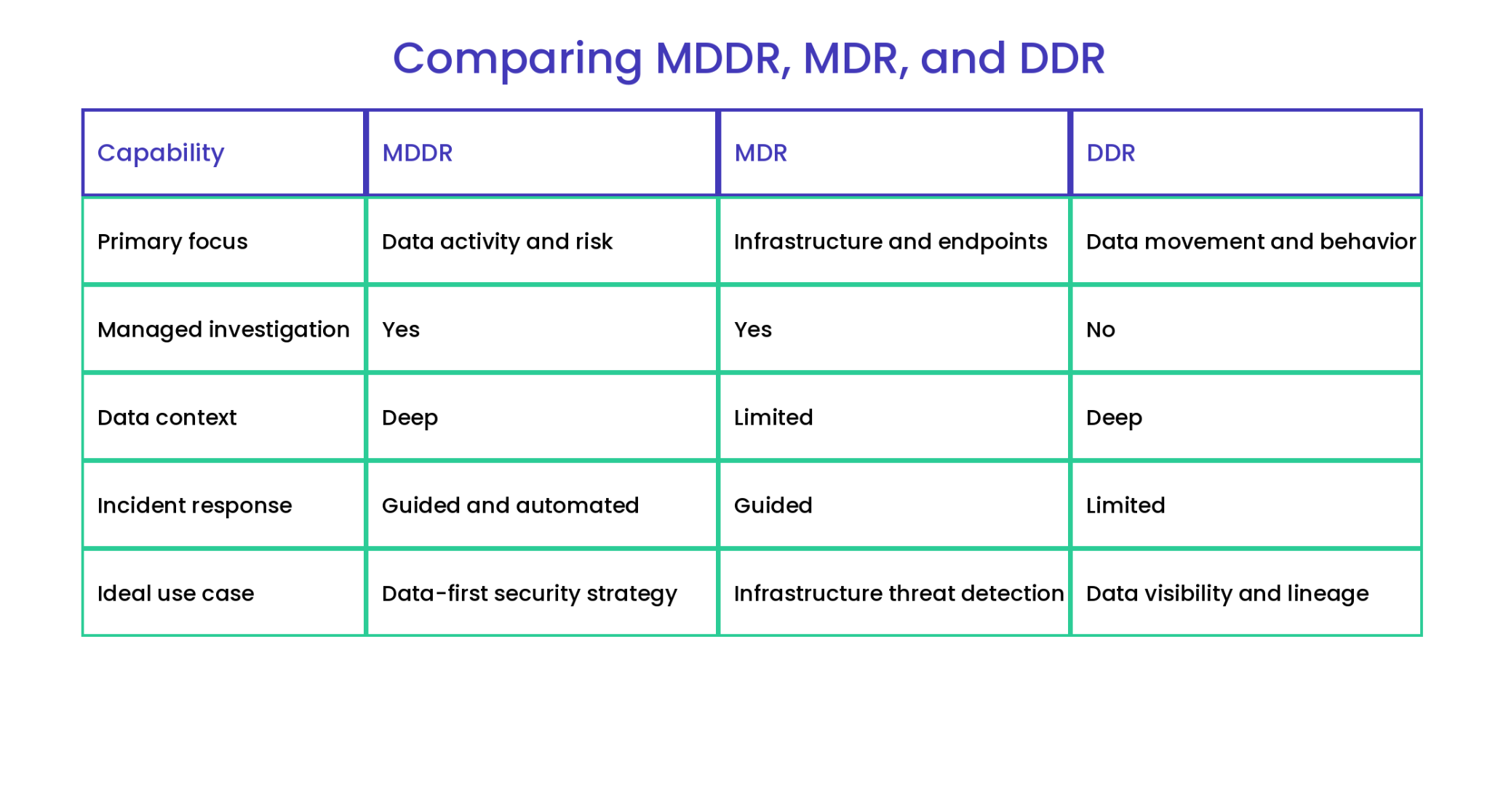 MDR focuses on detecting and responding to threats across endpoints, networks, and infrastructure. MDDR complements this by prioritizing data activity and context, helping organizations understand which data is at risk and why it matters.