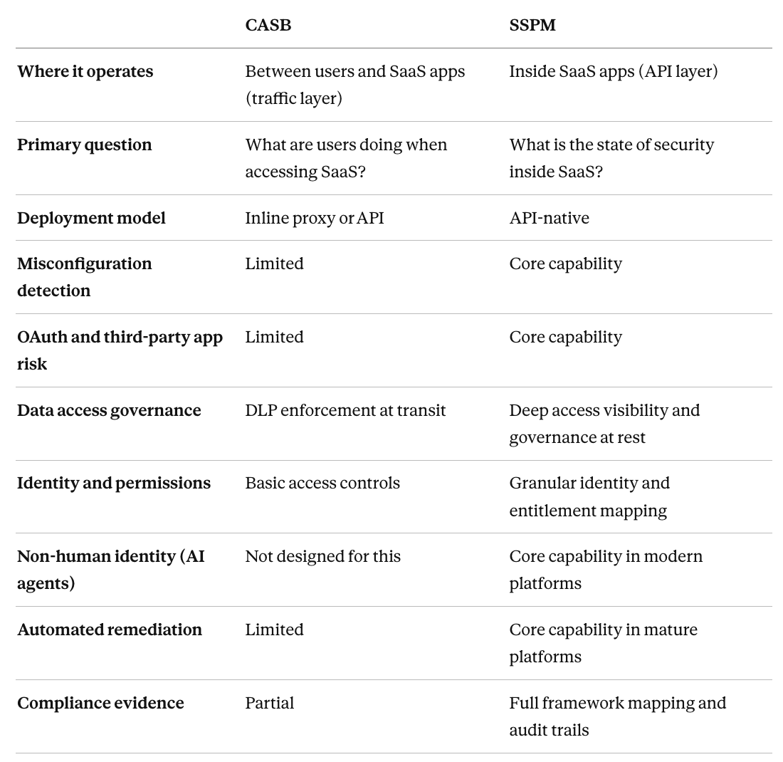 The key point? CASBs are strong at controlling the movement of data. SSPMs are strong at managing the state of your SaaS environment. These are related concerns, but they aren't the same concern.