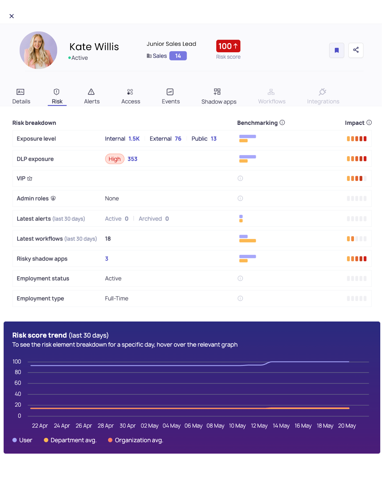 This ensures security teams focus only on meaningful risk, not a flood of generic alerts, all while pinpointing WHO the risky user is.
